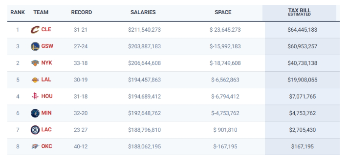 8队超奢侈税线 骑士6445万压勇士 湖船火在列雷霆仅缴17万